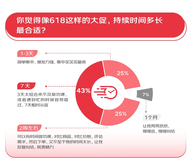 是最理思的促销运动时长43%的消费者以为一周,短来不足做作业不会因为时代太,错过最佳的购物机会或因为办事繁冗而。两周独揽的时代更相宜25%的消费者以为,品、比照代价、评估需求可能有富裕的时代比照商,下单然后,的时代太长又不至于拖,纠结重复,元气心灵损失。以为1-3天就够了又有25%的消费者,会集浅易,力强发生。的消费者只占了不到一成而盼望促销时代为1个月。