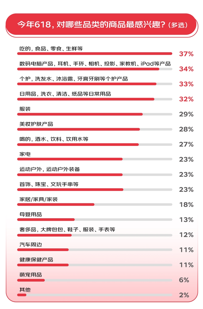 么?调研结果显示本年618买什,食为天”“民以,正在内的食物大类消费志愿最强消费者对包含零食、生鲜等,37%票选达,码电脑产物其次是数,34%票选达超九成消费者希望大促时间控制在2周内 6。品更新换代速数码电脑产,年618是购置数码产物的好机会良多数码产物资深用户都显露每,智能研习机、平板电脑等产物估计将正在本年618热销诸如运动耳机、强壮手环、相机、高清便携投影机、18去哪儿购物?京东以70%得票率位列第。些寻常刚需高频消费品来说关于个护产物、日用品这,个相宜的囤货时代618天然也是一,33%和32%消费志愿别离为。装和美妆护肤品紧随其后的是服。