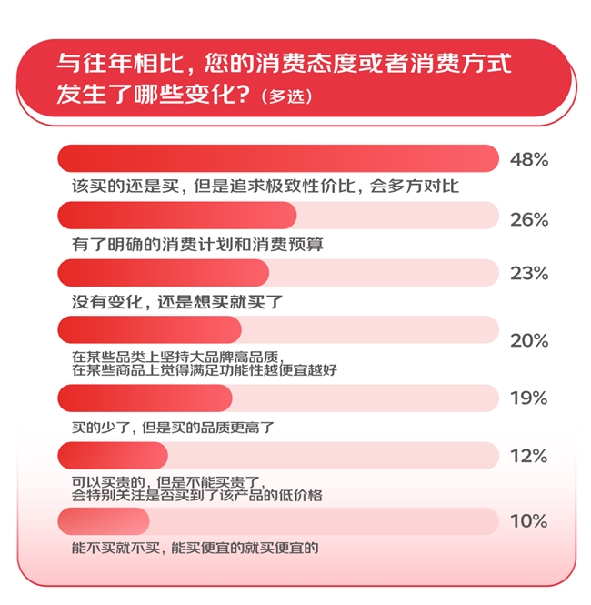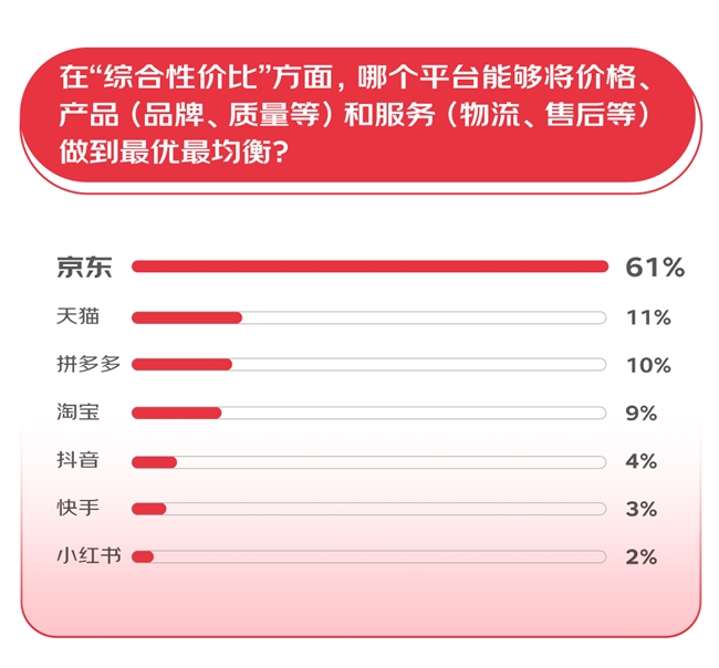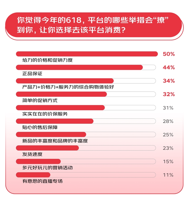 8和双11旧年的61,家都正在“卷低价”无论消费者照样商,注点一经产生蜕化而本年消费者的闭,归纳性价比和归纳效劳体验正在闭怀代价力的同时也闭怀。果显示调研结,间给力的代价和促销力度更要紧有50%的消费者票选618期,台的正品保障44%敬重平,力+效劳力的归纳购物体验34%敬重产物力+代价。和消费式样上正在消费立场,48%的投票率位居榜首“寻觅极致性价比”也以,性价比”的明了而关于“极致,的人以为64%,格低贱的超越预期极致性价比不是价,网最低价也不是全,合体验好而是综,代价表是除了,、增值效劳等多个要素归纳品牌、质地、物流,心的归纳购物体验让消费痛速、舒。