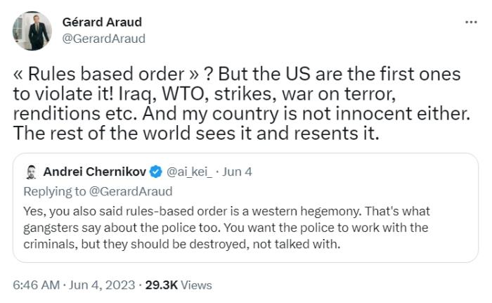 此对观法国前驻美大使发推:如此对待,交部默示中海表,纪律的保护者中方是国际,国际纪律、以合伙国宪章主旨和规矩为根底的国际相闭基础法规永远坚毅保护以合伙国为重心的国际体例、以国际法为根底的。纪律的不是中方而是美方损坏、蹂躏国际原则和。劝美方中方奉,乱扣“帽子”与其给别人,躬自省不如反,舛讹厘正,、恭敬主权摒弃霸权,谋安静相处之道摒弃霸道、共,力于互利共赢摒弃霸凌、致。